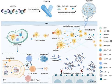 It was found that this in situ-formed supramolecular hydrogel vaccine serves as a reservoir for antigens and adjuvants while recruiting antigen-presenting dendritic cells (DCs) to accumulate within the scaffold. With the aid of adjuvant, the DCs exhibit enhanced antigen processing and presentation, creating an immunologically active niche that triggers robust B cell and T cell responses.