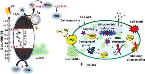 The nanoparticles exhibited a minimum inhibitory concentration (MIC) of 50 µg·ml⁻¹, a level comparable to that of the conventional antibiotic ciprofloxacin. This potent efficacy is driven by a three-pronged mechanism: electrostatic destabilization of bacterial membranes, generation of reactive oxygen species (ROS) under visible light, and controlled release of silver ions that inflict intracellular damage.
