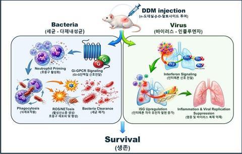 To evaluate its preventive effects, the research team administered DDM to experimental animals one day before exposure to infection. When subsequently challenged with highly pathogenic antibiotic-resistant bacteria and influenza virus, all animals in the untreated control group died. In contrast, animals pretreated with DDM showed 100% survival, demonstrating a striking protective effect.